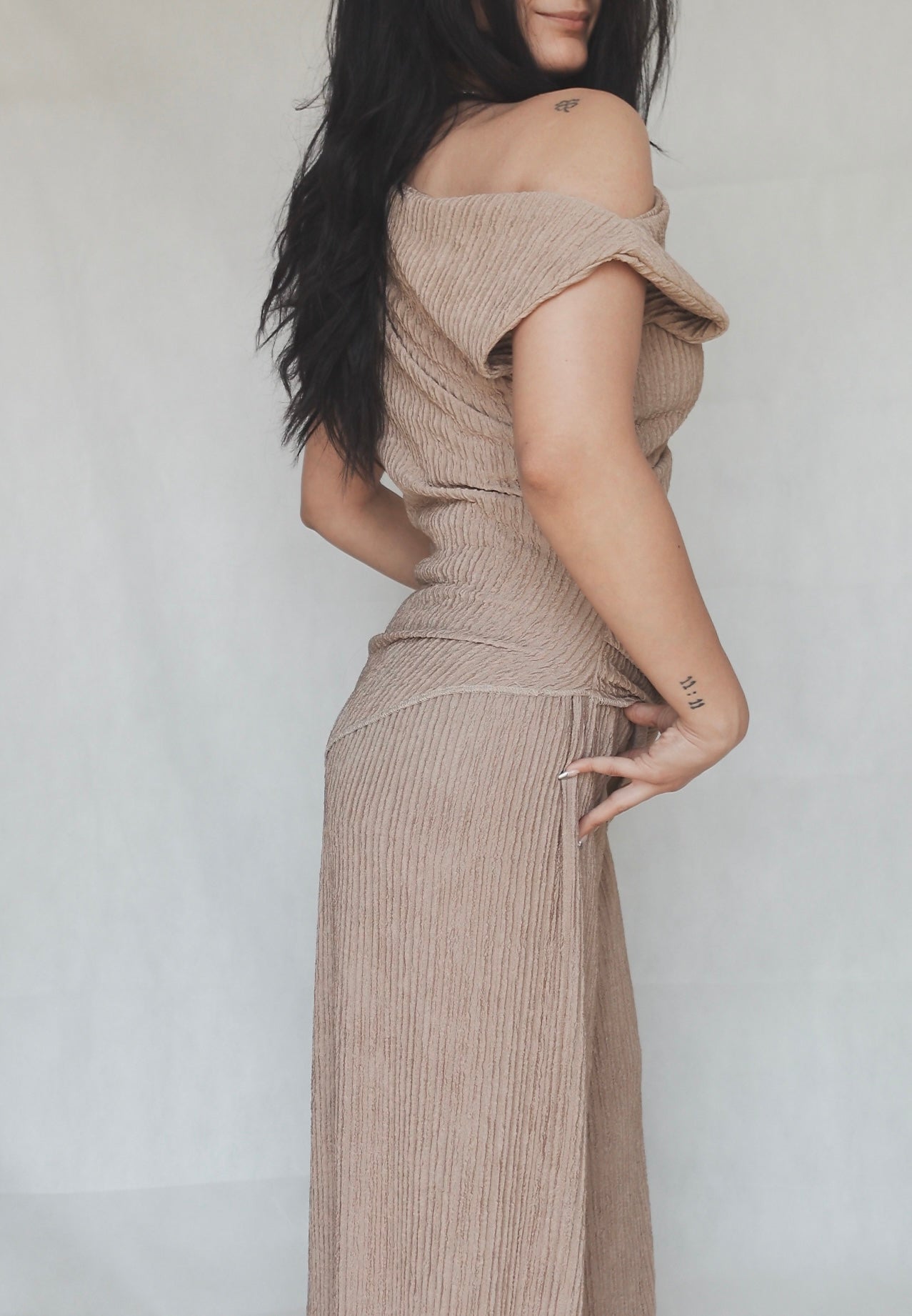 A match made in fabric heaven. The Amore Set pairs our figure-flattering Amore Top with the relaxed, draped elegance of the Richie Pants—both crafted in our signature beige crinkled texture that flows with you, not against you.